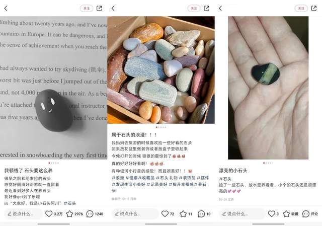 在小红书上,“养石头” 成为结交同好、收获关注的流量密码。搜索宠物石头,随处可见以石头口吻发布的 “征友帖”,帖子上配了几张自拍图,图上的石头被画上了五官、穿上了衣服,有了表情和性别。评论区里,养了石头的 “娃爸娃妈” 们纷纷替娃发声:“我叫大树,可以成为你的好朋友吗?” “我养了一只青色虎斑鹅卵石,名字叫 wasabi”。更多没有石头的人迅速从心动转化为行动:“这就去外面捡一颗,朋友等我。”