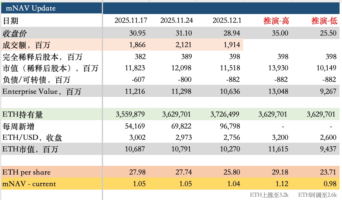 Conclusion: If ETH rebounds to 3.2k, mNAV will rise to 1.1, corresponding to a stock price of 35; if ETH falls to 2.6k, mNAV will fall below 1, corresponding to a stock price of 25.5. The conclusion is that the extreme range is 25.5~35.