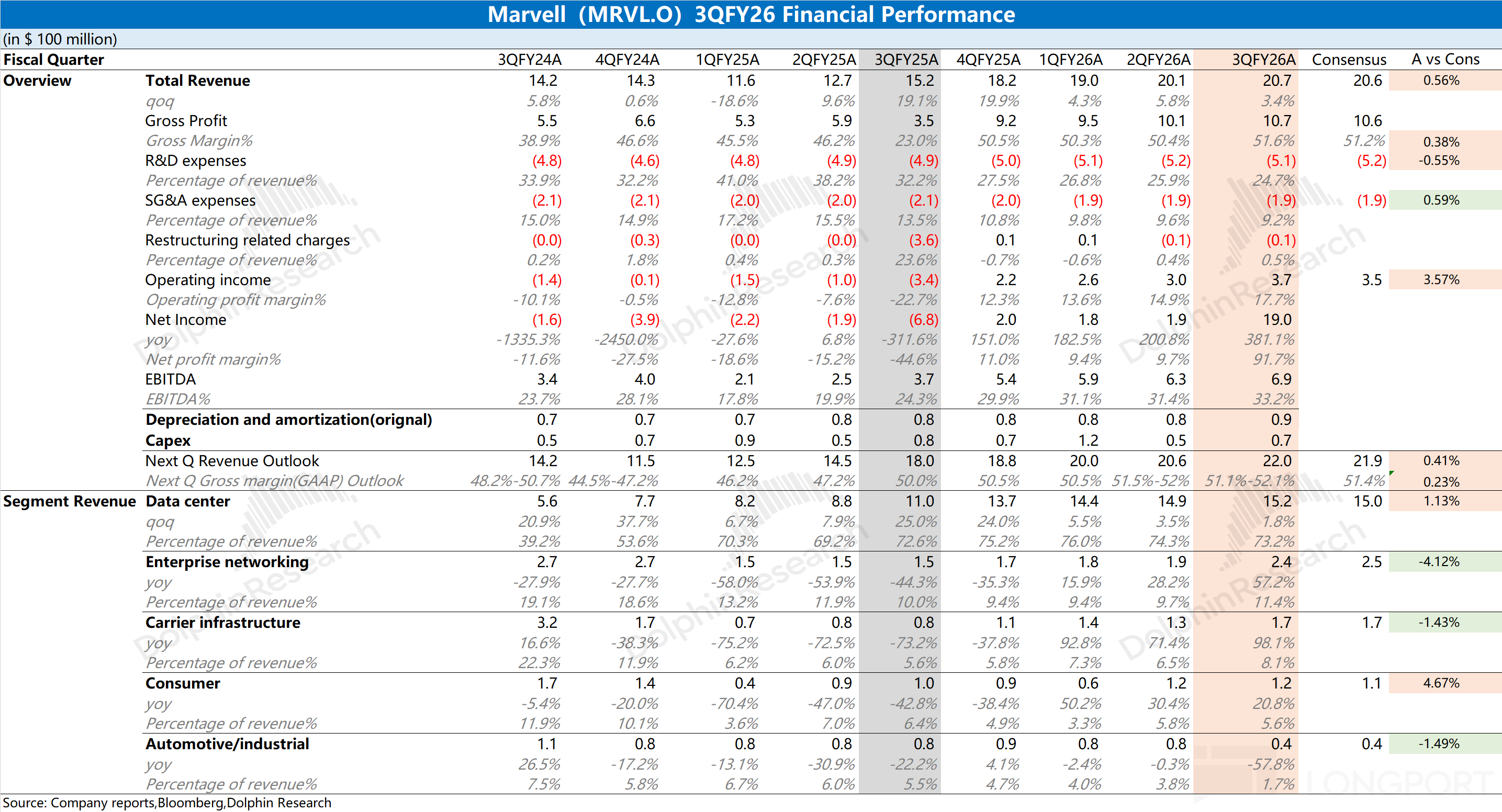 Marvell Technology achieved revenue of $2.07 billion in Q3 FY2026, a quarter-on-quarter increase of 3.4%, meeting market expectations ($2.06 billion). The company's revenue growth this quarter was mainly driven by enterprise networking and carrier business. Due to the quarter-on-quarter decline in custom ASIC business, data center business showed a slight quarter-on-quarter increase.
