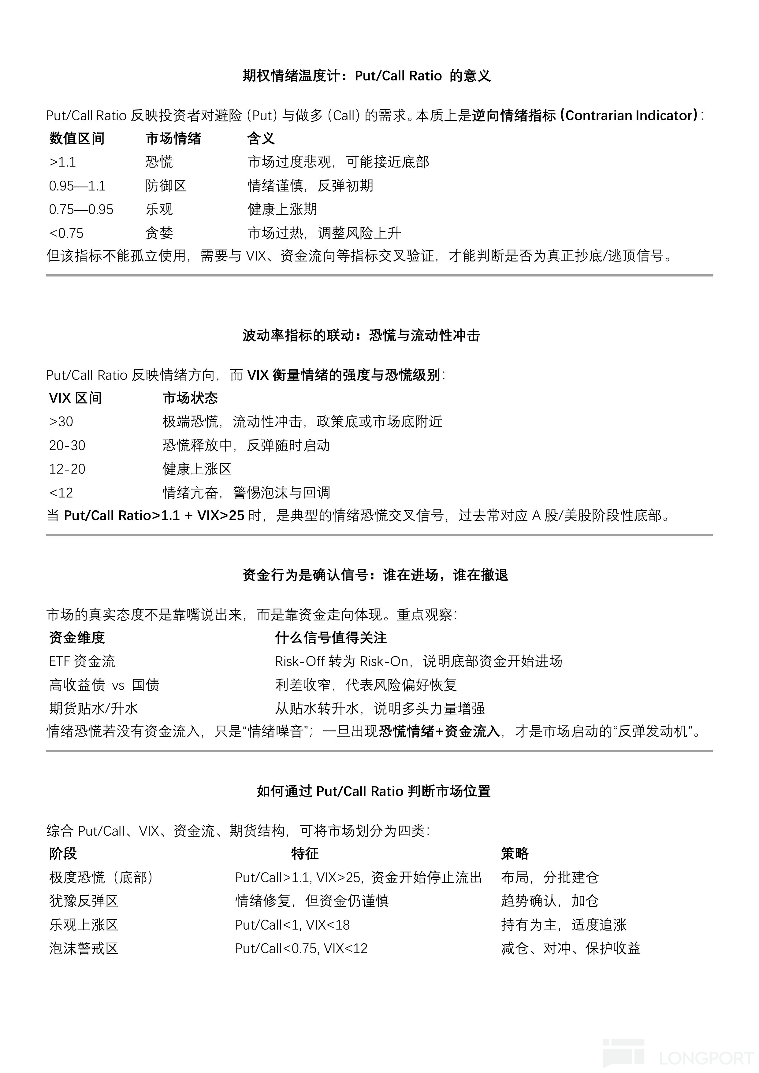 Bottom-fishing on sentiment reversal: When the ratio >1.1 and starts declining, combine with VIX and volume to time rebounds.