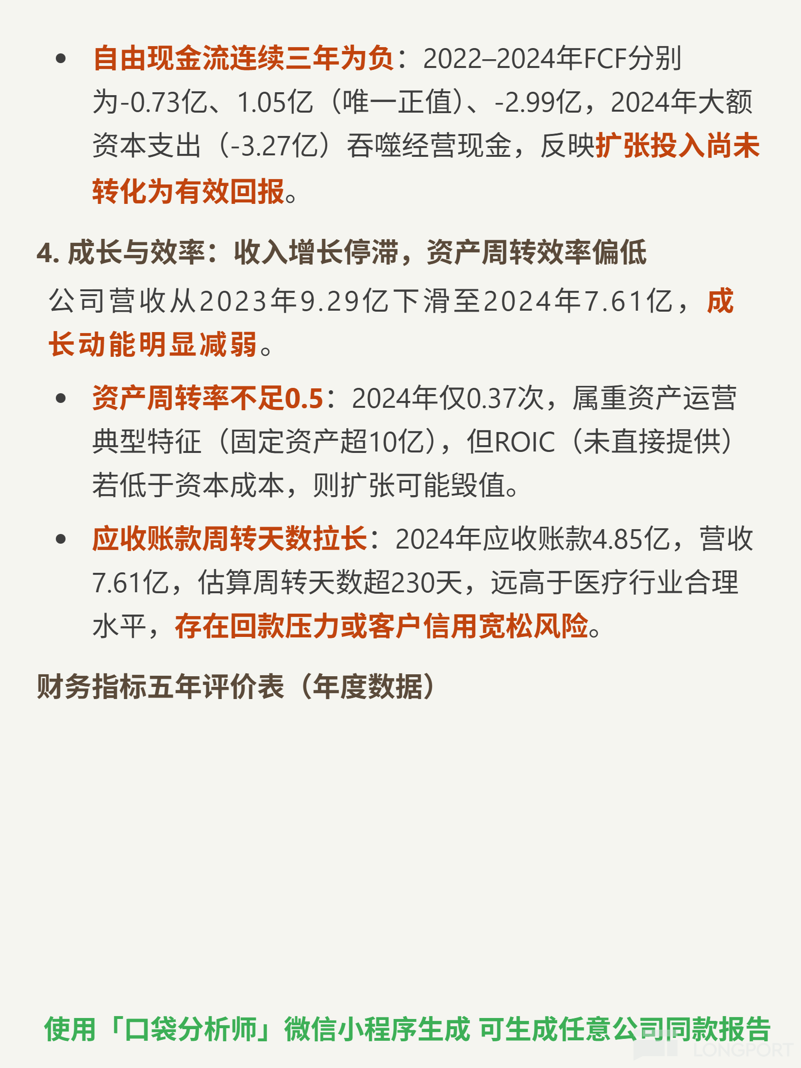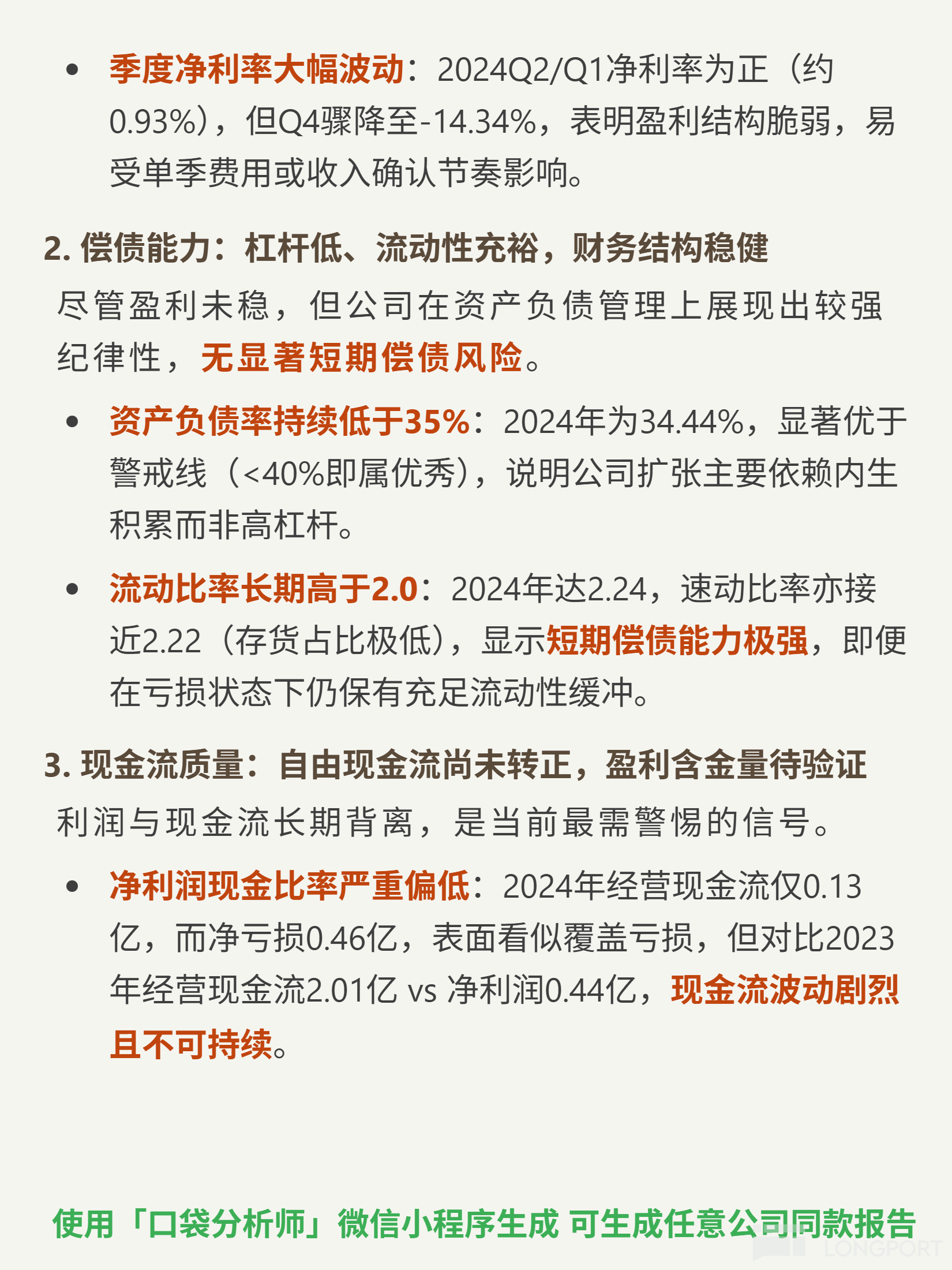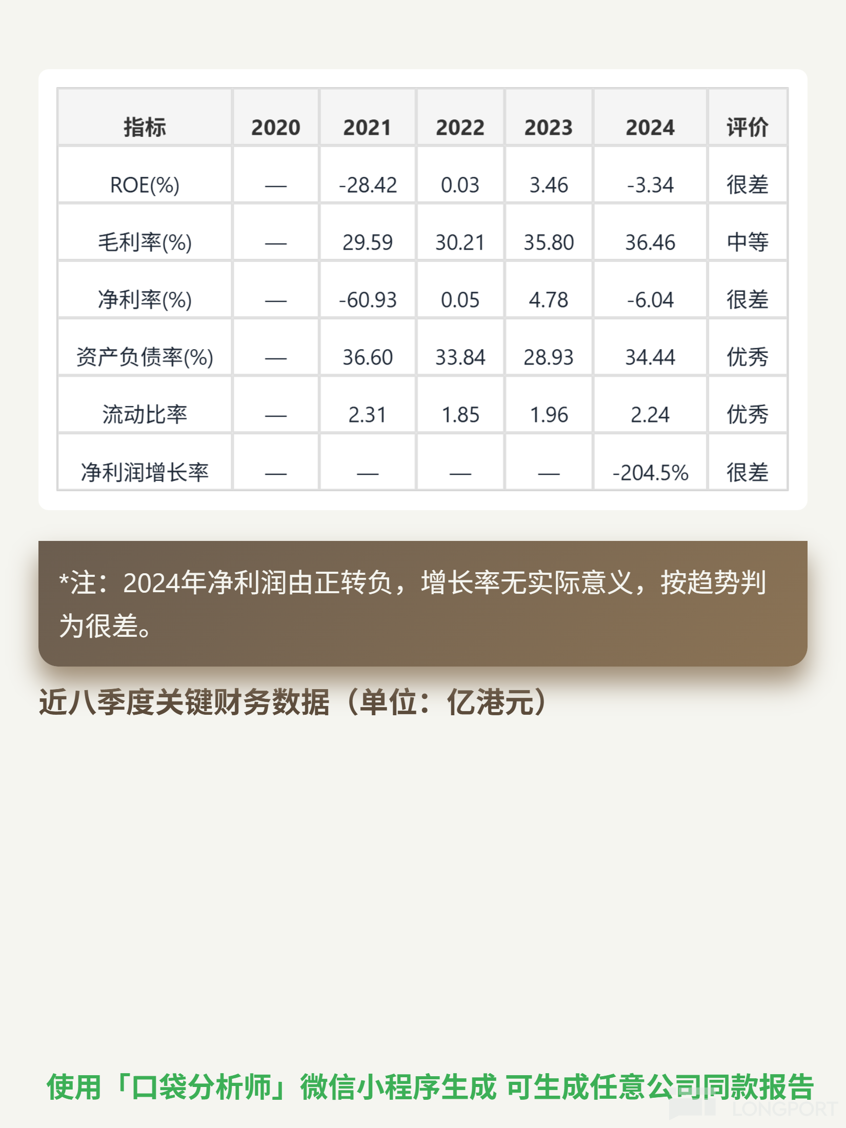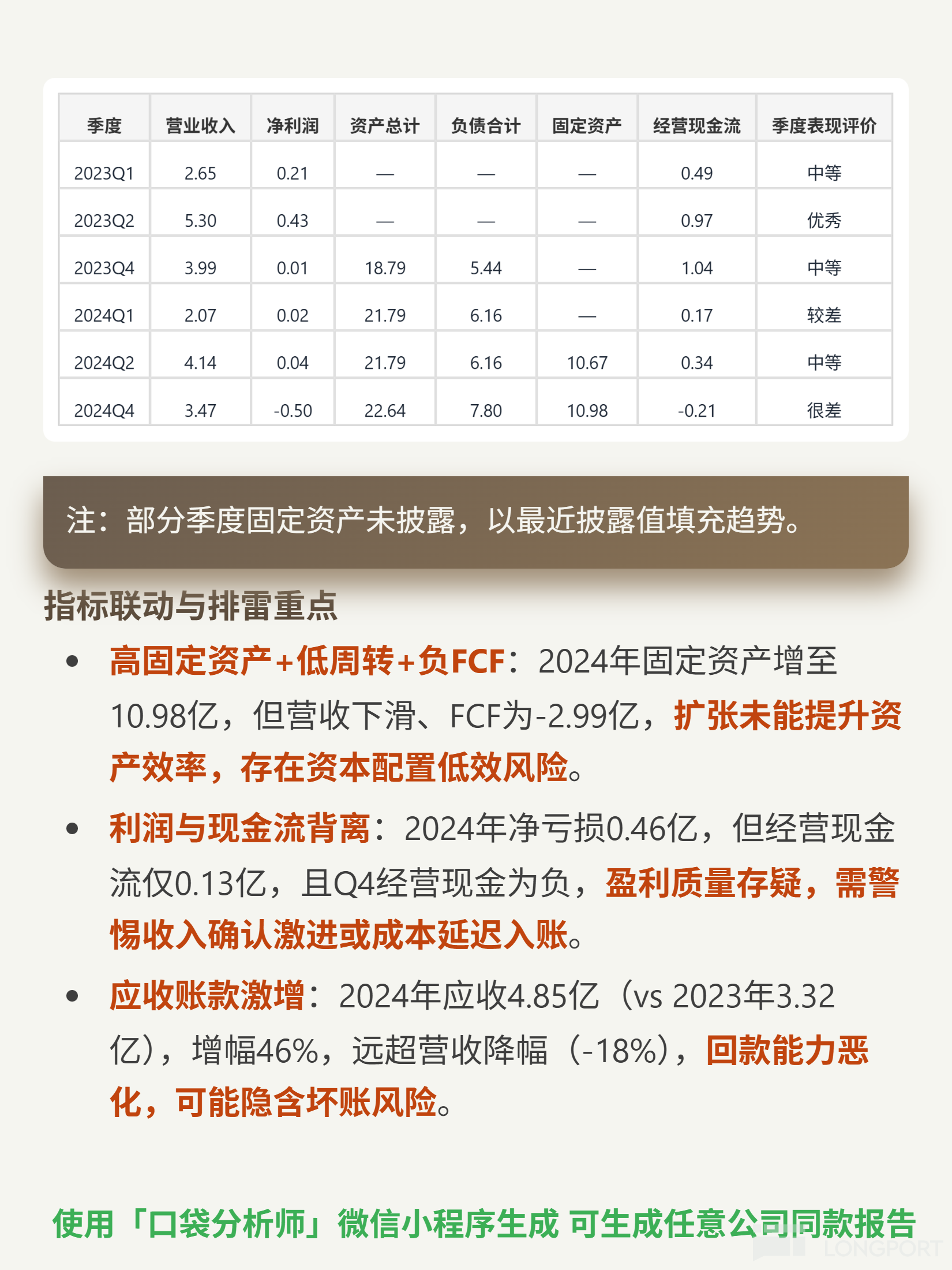 📈Financial performance: 2024 gross margin was 36.46% (moderate), but ROE -3.34%, net margin -6.04%, revenue fell to 761 million (929 million in 2023); debt repayment ability is stable (debt-to-asset ratio 34.44%, current ratio 2.24), but free cash flow was -299 million (negative for three consecutive years), accounts receivable increased by 46% (485 million), fixed assets were 1.098 billion but turnover rate was only 0.37 times, indicating low asset efficiency.