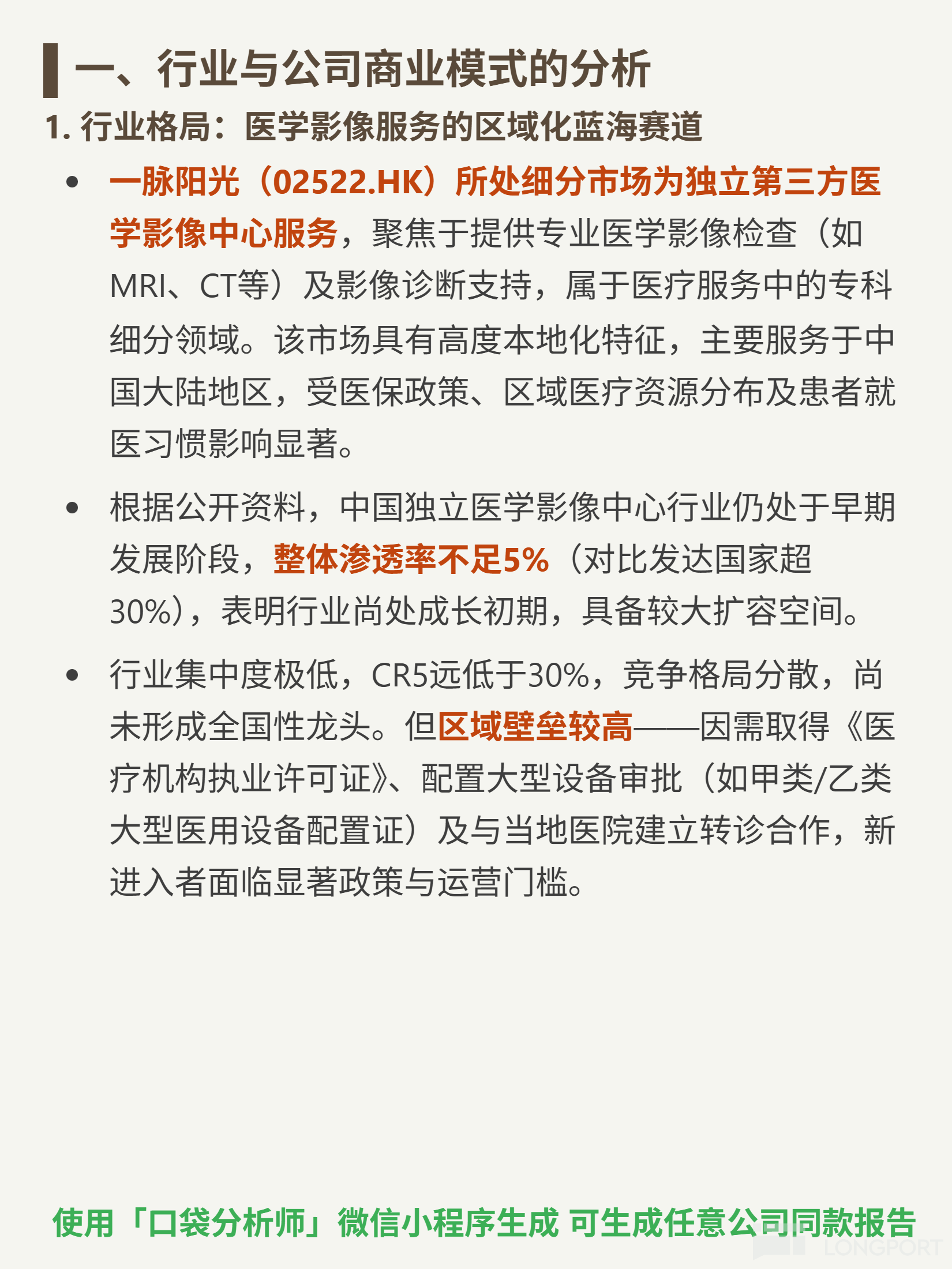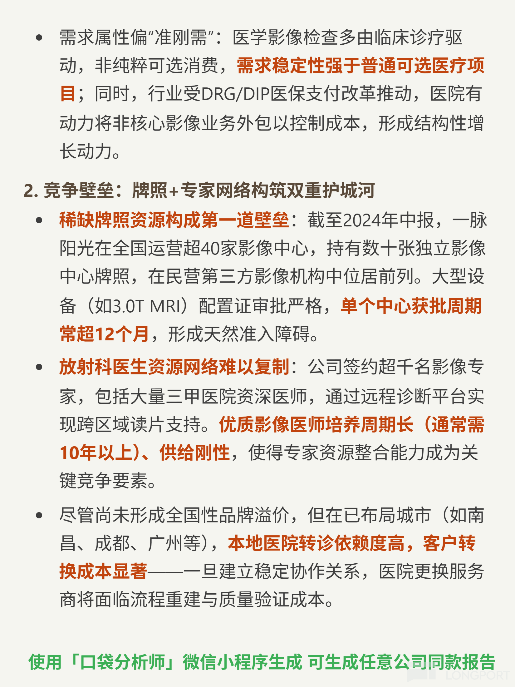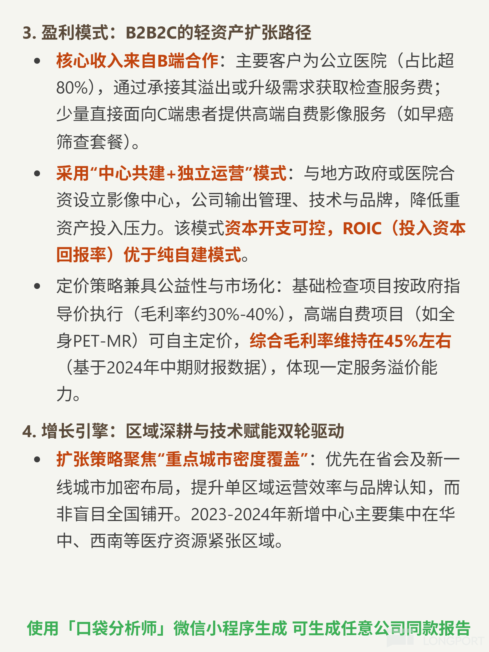 🎯Core logic: The company operates independent third-party medical imaging centers, providing MRI, CT, and other examinations and diagnoses, adopting a B2B2C model (mainly serving B-end hospital referrals). Industry penetration is less than 5% (over 30% in developed countries), with high regional barriers (requiring licenses, equipment approvals over 12 months, and hospital cooperation). Demand is quasi-essential (clinically driven, with DRG/DIP promoting hospital outsourcing). Competitive barriers are scarce licenses (operating over 40 centers) and a remote reading network of over 1,000 top-tier experts.