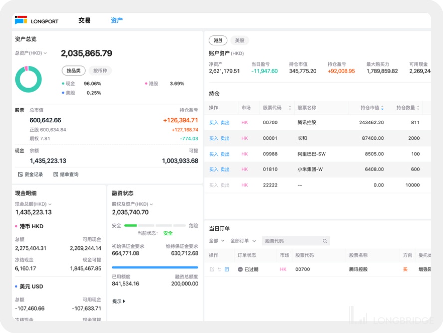 资产面板包含了用户主要资产数据,包括资产总览、现金明细、融资状态、持仓和订单情况等。