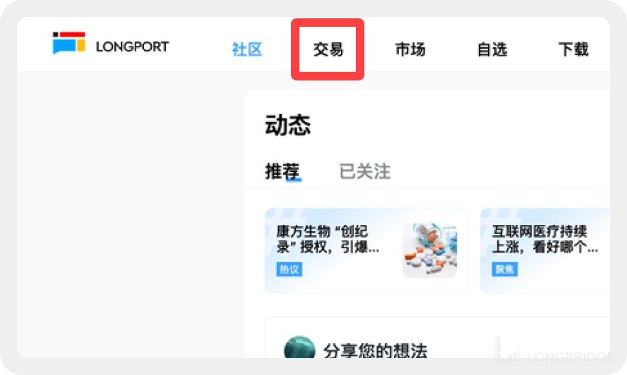 打开 LongPort 官网 并点击登录,登录成功后点击一级菜单「交易」,进入 Web 交易页面。(若未开户看不到交易入口,需要先去开户,暂时只支持综合账户)