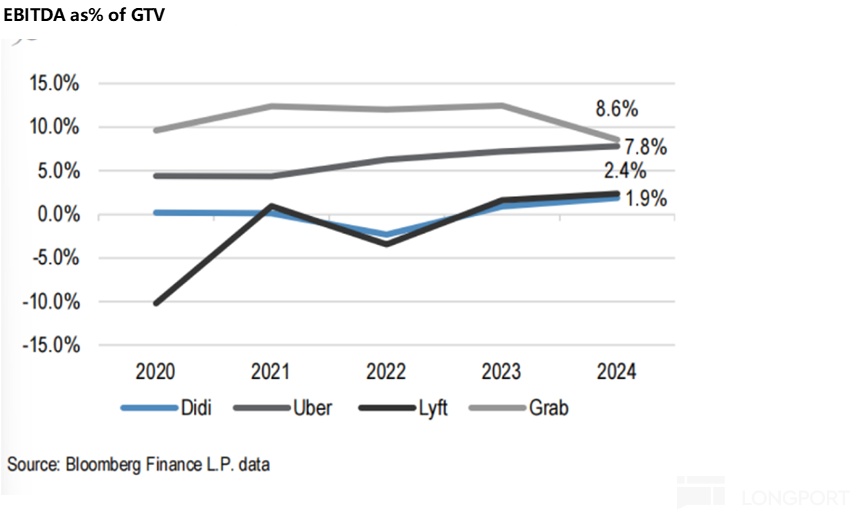 On EBITDA/GTV, ride-hailing margins are structurally low. Uber, aided by global scale and Delivery, leads the group but still sits below 10%, while Didi is in low single digits.