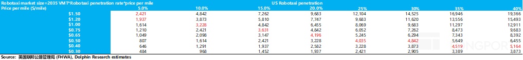 Given high vertical integration (purpose-built AV platform + software/hardware), a vision-only stack, and Cybercab BOM already at ~$25k–$30k, Dolphin Research sees higher probability for $0.4–$0.6/mile for Tesla.