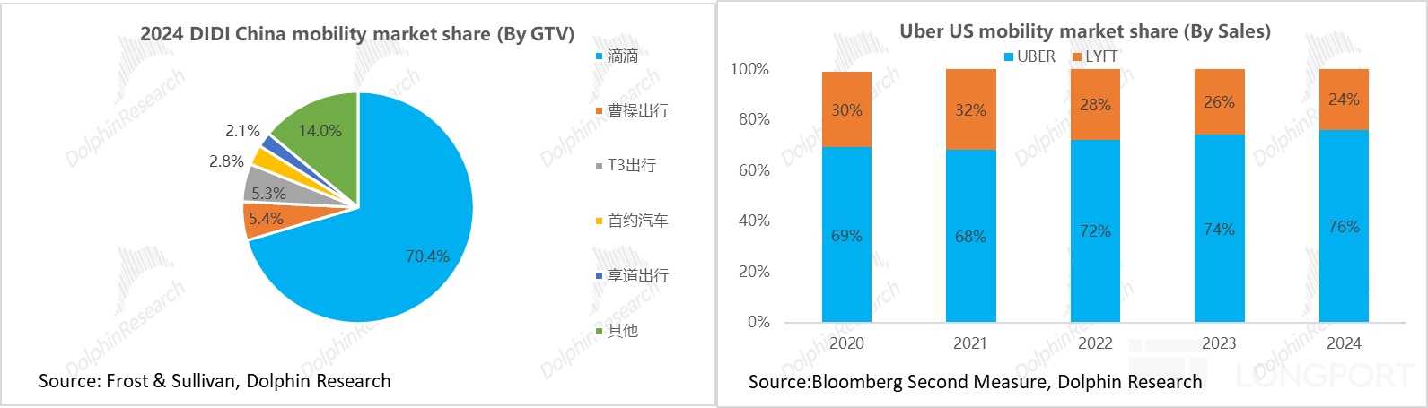As a result, ride-hailing's share of US mobility is even lower than in China. By spend, Dolphin Research estimates ride-hailing + taxis were only ~3% of total mobility in 2024, vs. ~9% in China.
