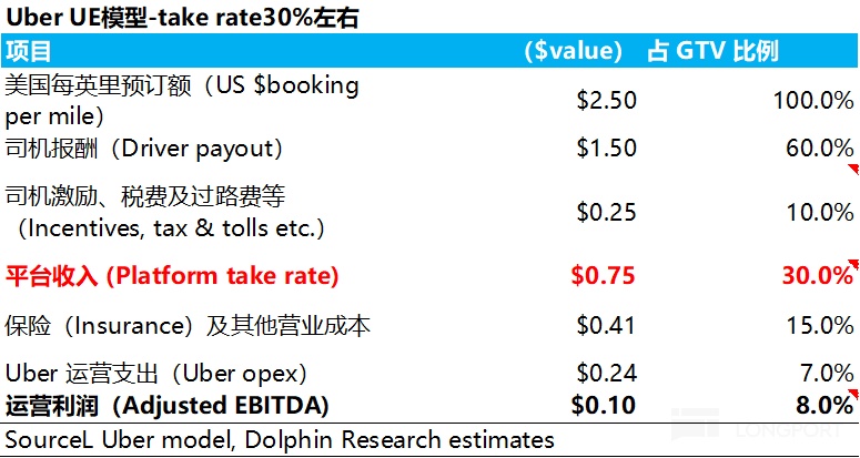 First, the pre-Robotaxi US ride-hailing UE: Uber prices at ~$2.5/mile; the platform take is ~30%, and ~70% (~$1.75/mile) goes to drivers, of which ~40% is pure labor return. Ex-labor, vehicle OPEX (depreciation, energy, insurance, maintenance) is ~$0.7–0.8/mile, about 30% of GTV.