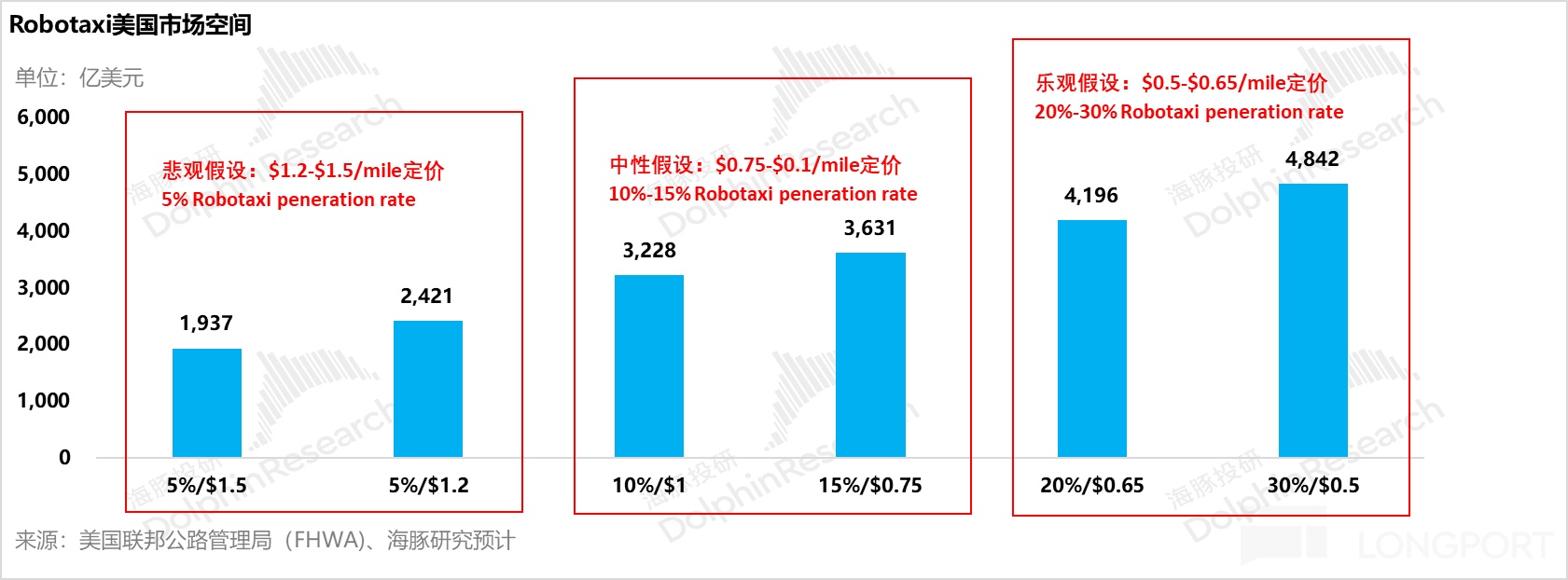 iii) Bull ($0.5–$0.65/mile): clearly cheaper than private cars, making ownership uneconomic. Penetration reaches 20%–30%, and market expands to ~$420–$485bn (5–6x), reshaping mobility economics.