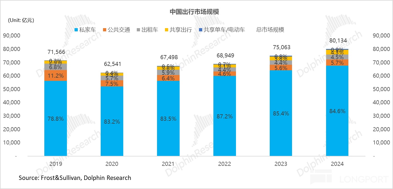 Even combined, ride-hailing + taxis remain sub-RMB 1tn, a fraction of the RMB 6.8tn private-car market. The market headroom is clearly constrained.