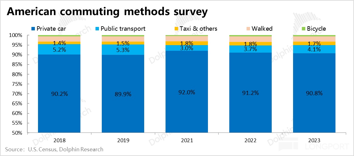 Private cars dominate commuting, per the US Census: private-car share is ~91%, public transit 3%-5%, and taxis + ride-hailing under 2% (commute only). The usage footprint is narrow.