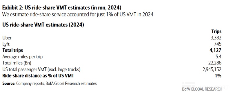 Per FHWA, US vehicles drove nearly 3.3tn miles in 2024; backing out ~10% for trucks implies ~3.0tn passenger miles. Ride-hailing orders were ~4.13bn; at an avg. 5.4 miles per trip, total passenger miles were ~22.7bn, only ~0.8% of passenger VMT.