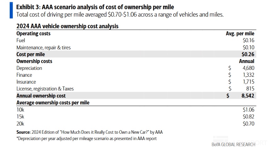 Per AAA, at 10k–20k miles per year, private-car cost is ~$0.7–$1.1/mile. US ride-hailing fares run about $2.5/mile, much higher than private usage.