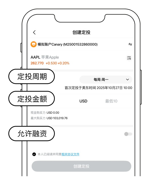 2. Set the fixed investment cycle (weekly, bi-weekly, or monthly) and the fixed investment amount (minimum $10).