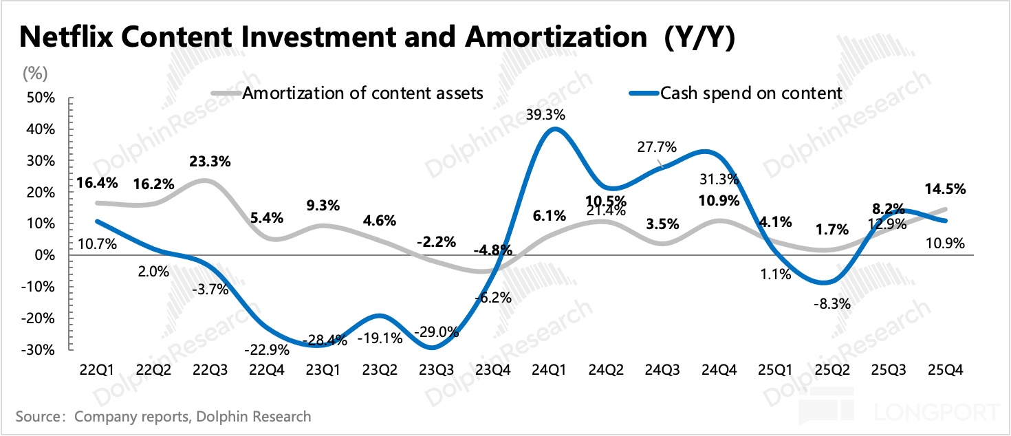 Full-year spend was 17.7 bn, below the ~18 bn start-of-year plan. With heavier amortization amid more Q4 tentpoles, content assets rose less than 0.2 bn QoQ.