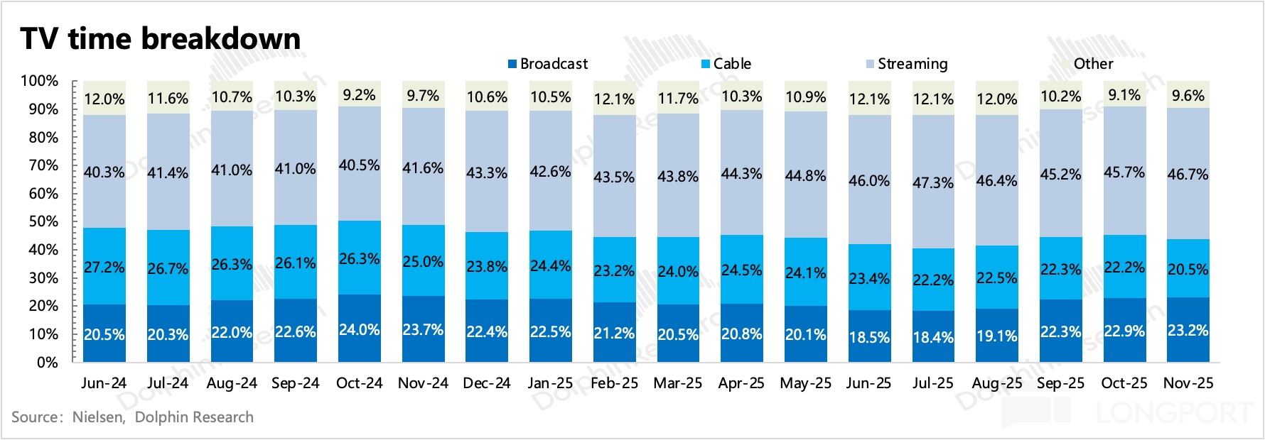Per Nielsen NA, as legacy media shifts to streaming, cord-cutting continues and streaming share reached 46.7%. Within streaming, Netflix’s share remained stable; stronger H2 tentpoles lifted viewing time +2% YoY, better than H1.