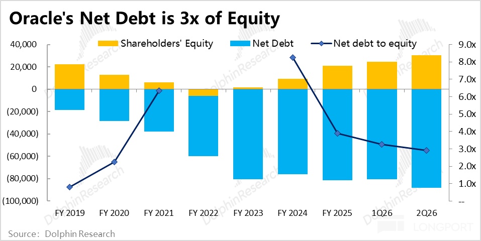 The funding gap must be filled by cash on hand or debt. Cash is limited at sub-$20 bn as of 2Q26, and net debt is nearly 3x shareholders' equity, with the true Capex and issuance peak still ahead.