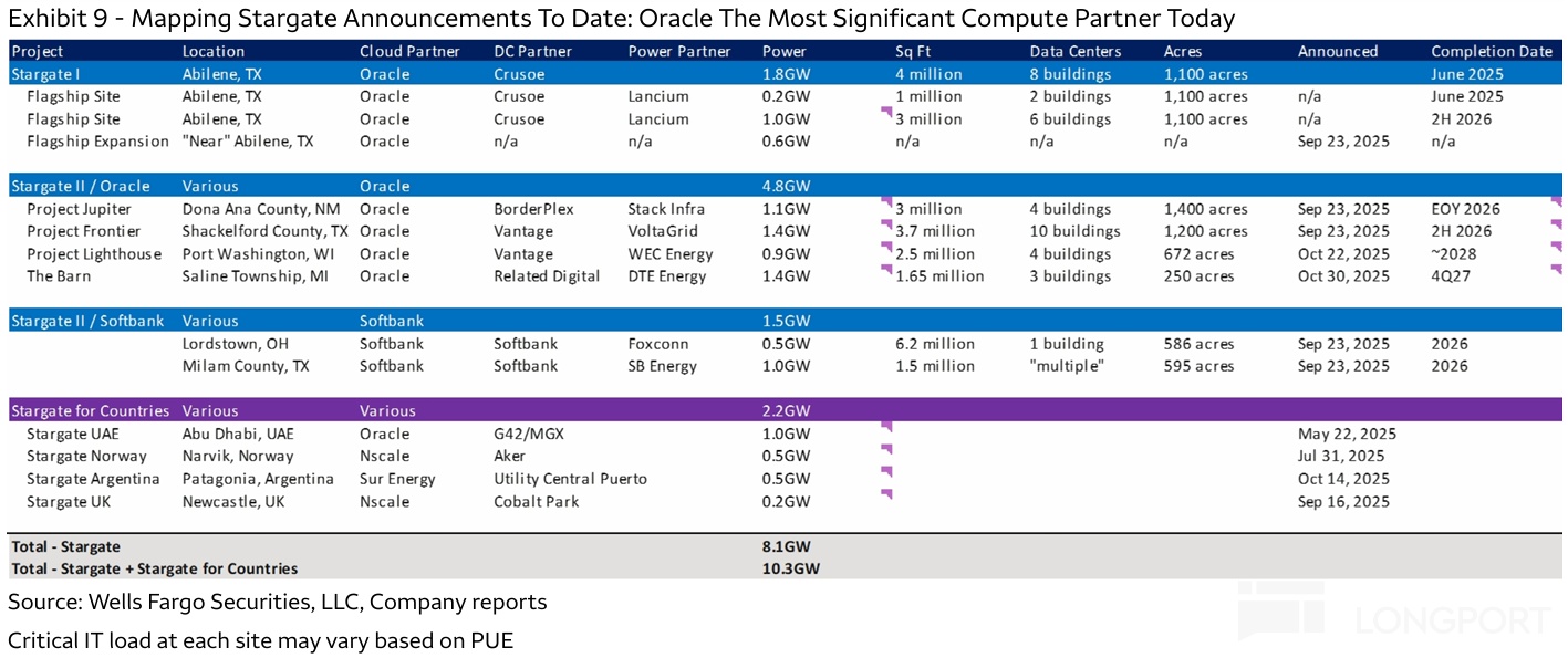 a. A $100 bn-class order was telegraphed: Before the 1Q26 print, Oracle disclosed signing an annual ~$30 bn cloud order with a customer starting FY28, without term or total value. On Jul 22, OpenAI announced, under the Stargate framework, a second batch of ~4.5 GW compute supply deals, i.e., the four projects in Stargate II.