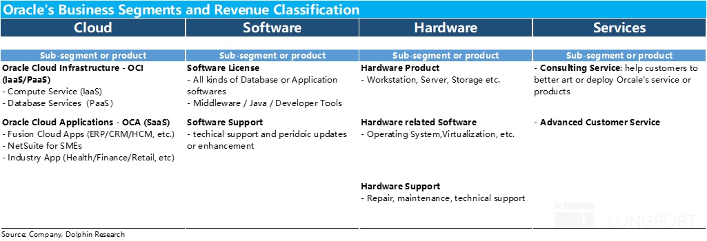 a. Cloud: The most important segment, split into IaaS via OCI and SaaS via OCA. OCA includes SaaS-ified ERP/CRM/HCM and vertical apps, while OCI comprises database services and compute leasing.
