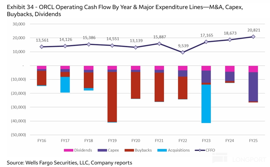For over a decade Oracle has run a leveraged model. Since FY16, cash outlays have exceeded OCF almost every year — historically for buybacks and M&A, and ahead for Capex.