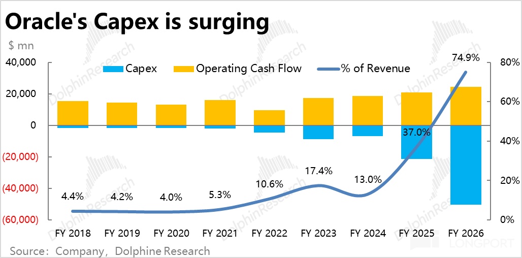 d. Heavy Capex and leverage, with the peak still ahead: Like CoreWeave, massive DC buildouts strain cash flow and the balance sheet. Management guides FY26 Capex to double to ~$50 bn, or ~75% of revenue and more than 2x projected OCF.