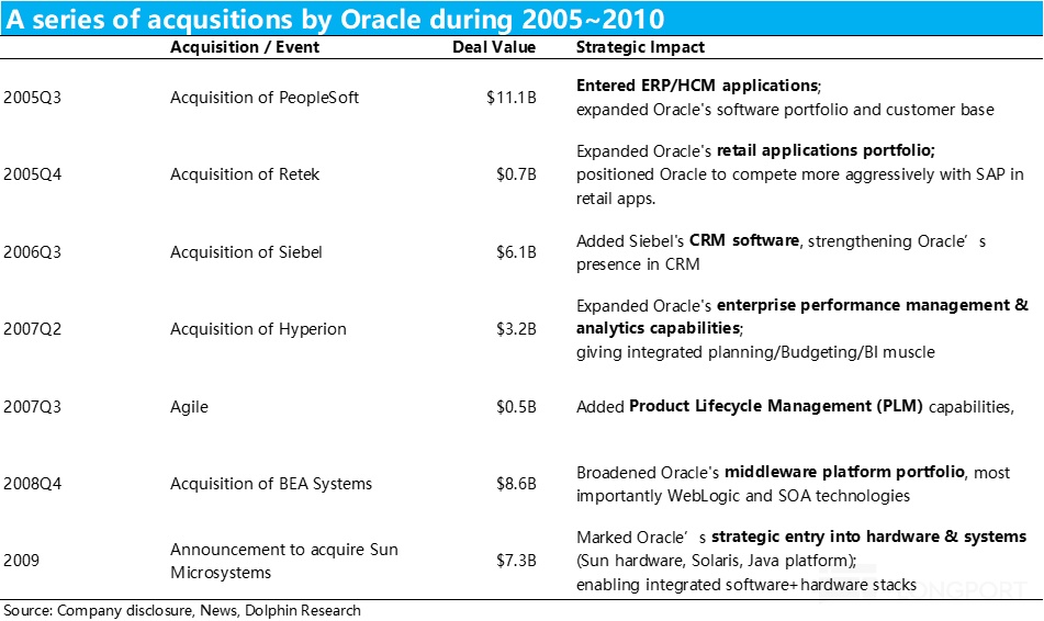 The capstone was acquiring Sun Microsystems, which pushed Oracle from software into hardware and operating systems. This set up a broader stack play.