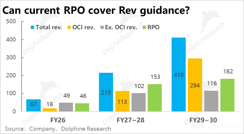 The latest RPO buckets by delivery window roughly map to FY26, FY27–28, and FY29–30 guidance. We observe the following.