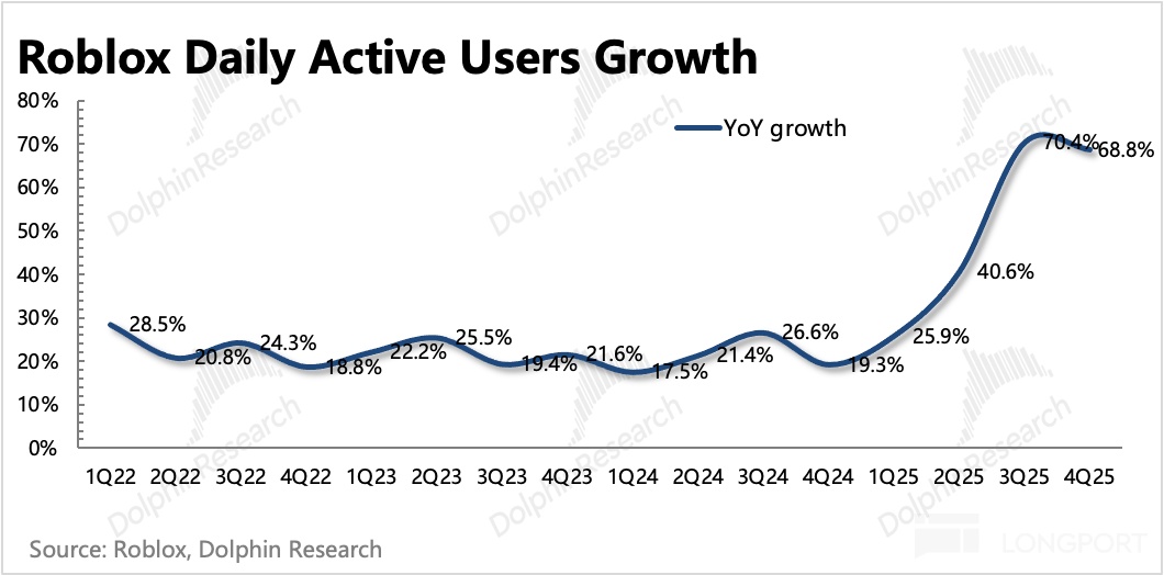 However, actuals were better: Q4 DAUs grew 69% YoY, and total hours engaged rose 88% YoY, with hours per DAU up 11% YoY. The 11% QoQ decline, though higher than the historical 3%–9% range, is acceptable considering the record peak in Q3 and seasonal back-to-school factors.