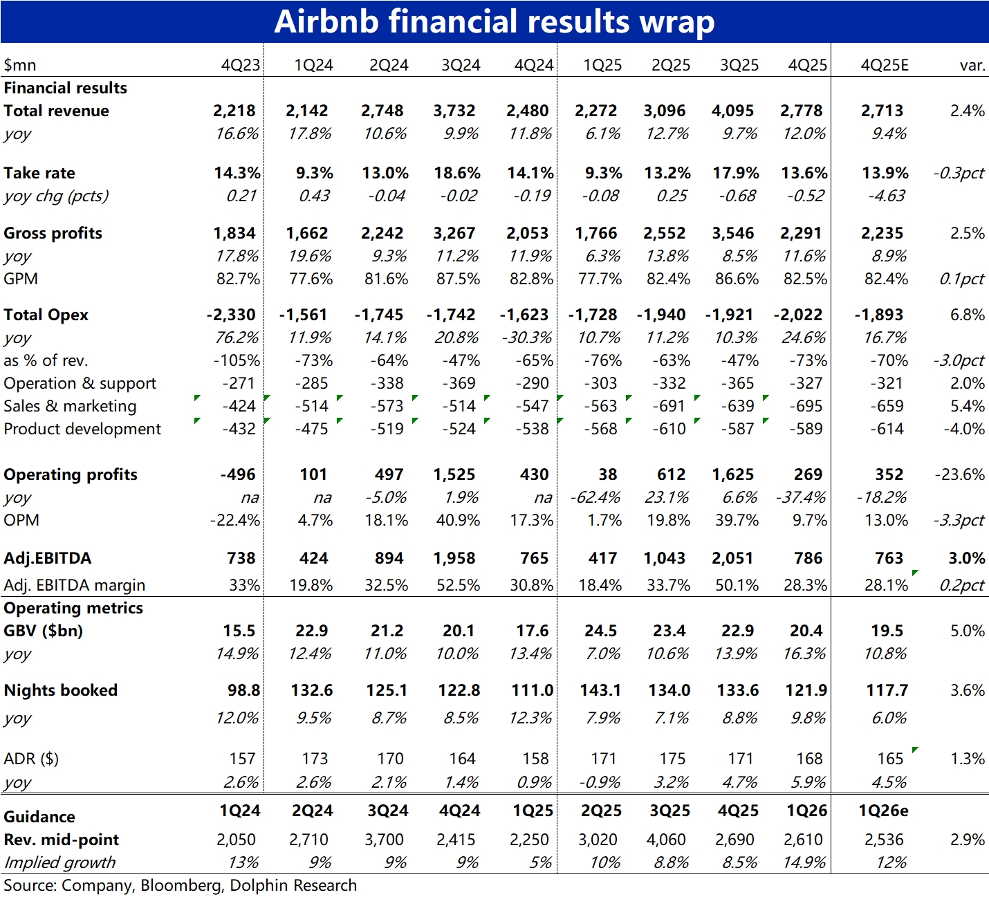 ABNB 4Q25 First Take: Results came in ahead of expectations. Core operating metrics accelerated across the board, defying prior guidance for a slowdown and marking the year's strongest growth. The rub: opex expanded sharply, pressuring margins, though absolute profit still beat.