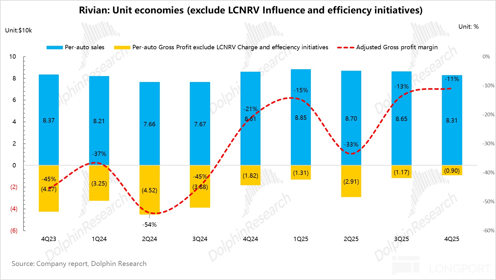Per-unit margin improved by ~$2.6k QoQ to approximately -$9k on lower variable cost. 'True' auto GPM rose from -13.5% in Q3 to -10.9% in Q4, sustaining the sequential uptrend.
