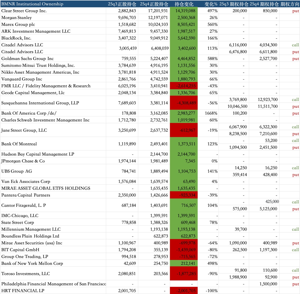Key Actions: Clear Street increased its holdings from 2.88M shares in Q3 to 17.2M shares, becoming the absolute largest holder. This indicates dozens of aggressive mid-sized hedge funds collectively went long on BMNR through Clear Street's channel in Q4.