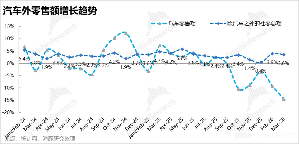 By category, autos—the largest single item—were notably weak in Mar, with YoY declines exceeding 10%, making them the biggest drag. Ex-auto, retail sales rose 3.2% YoY in Mar vs. 3.7% in Jan–Feb, only a modest slowdown. Excluding autos, other goods sales were not particularly weak in Mar.
