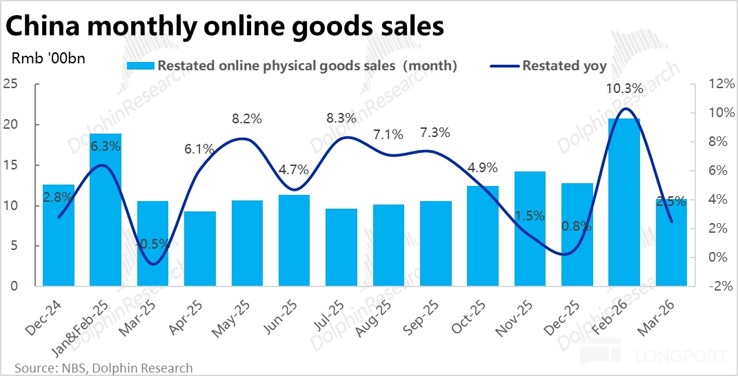 In Mar, online physical-goods retail rose 2.5% YoY, a sharp drop from 10.3% in Jan–Feb. That is also well below the 6.5% weighted average for Dec–Feb.