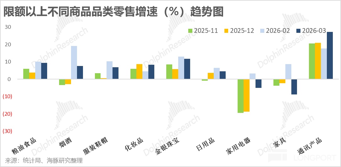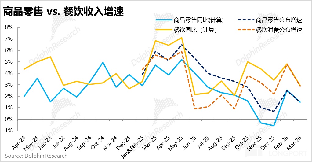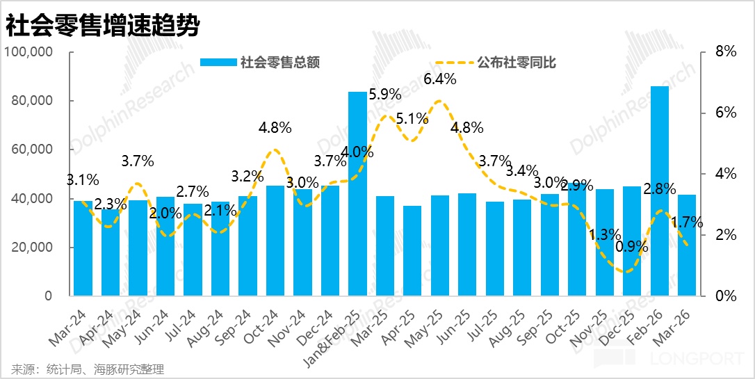 According to the NBS, Mar total retail sales rose 1.7% YoY. That sits roughly between Dec-25 and Jan–Feb growth rates, suggesting this month better reflects the current growth run-rate.