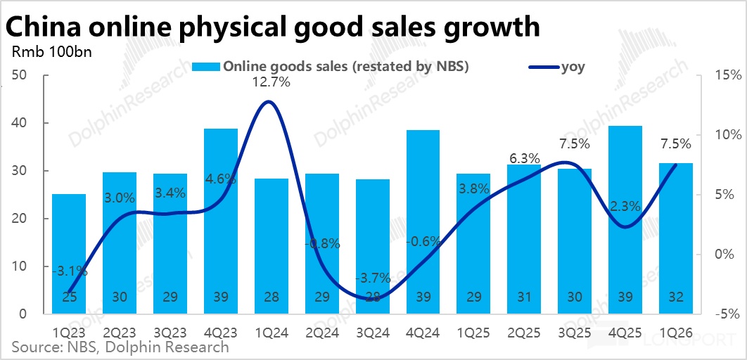This likely informs major e-commerce platforms’ post-Q1 growth outlook. Given the solid Jan–Feb, online physical-goods retail grew 7.5% in Q1, a clear rebound from the Q4 trough.