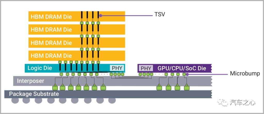 HBM 通过基板的硅互联层与主处理器连接,物理距离远远小于 PCB 上内存与处理器之间的连接,几乎逼近 L3 缓存的连接距离,尽管其运行频率不高,但是这个速度是真实速度,没有任何水分。