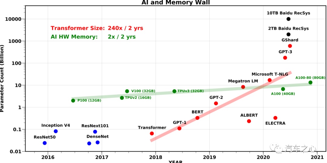 机器视觉的奠基者 ResNet 50 是 2500 万个参数,自动驾驶领域目前正火的 Transformer 在 9 千万到 3.4 亿之间,ViT 变种是 20 亿,GPT3 是惊人的 1750 亿。
