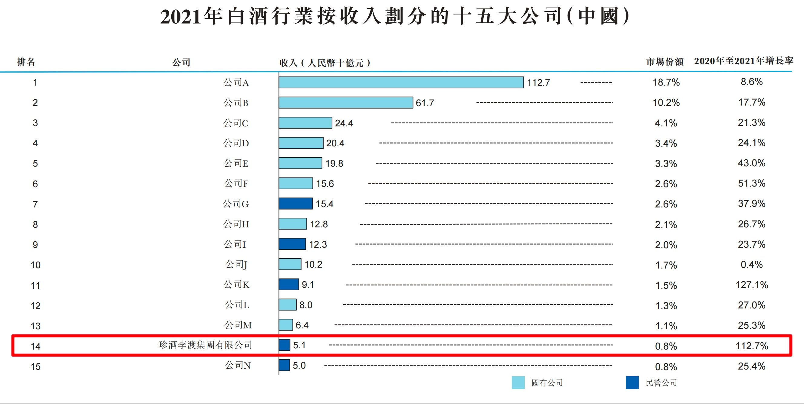 根据招股书显示,按照 2021 年营收计,珍酒李渡在国内民营白酒公司排名第 4;在整个国内白酒市场来看,珍酒李渡排名为 14 位,市场份额为 0.8%,2020 年至 2021 年增长率达到 112.7%,在前 15 大公司增速排名第 2,