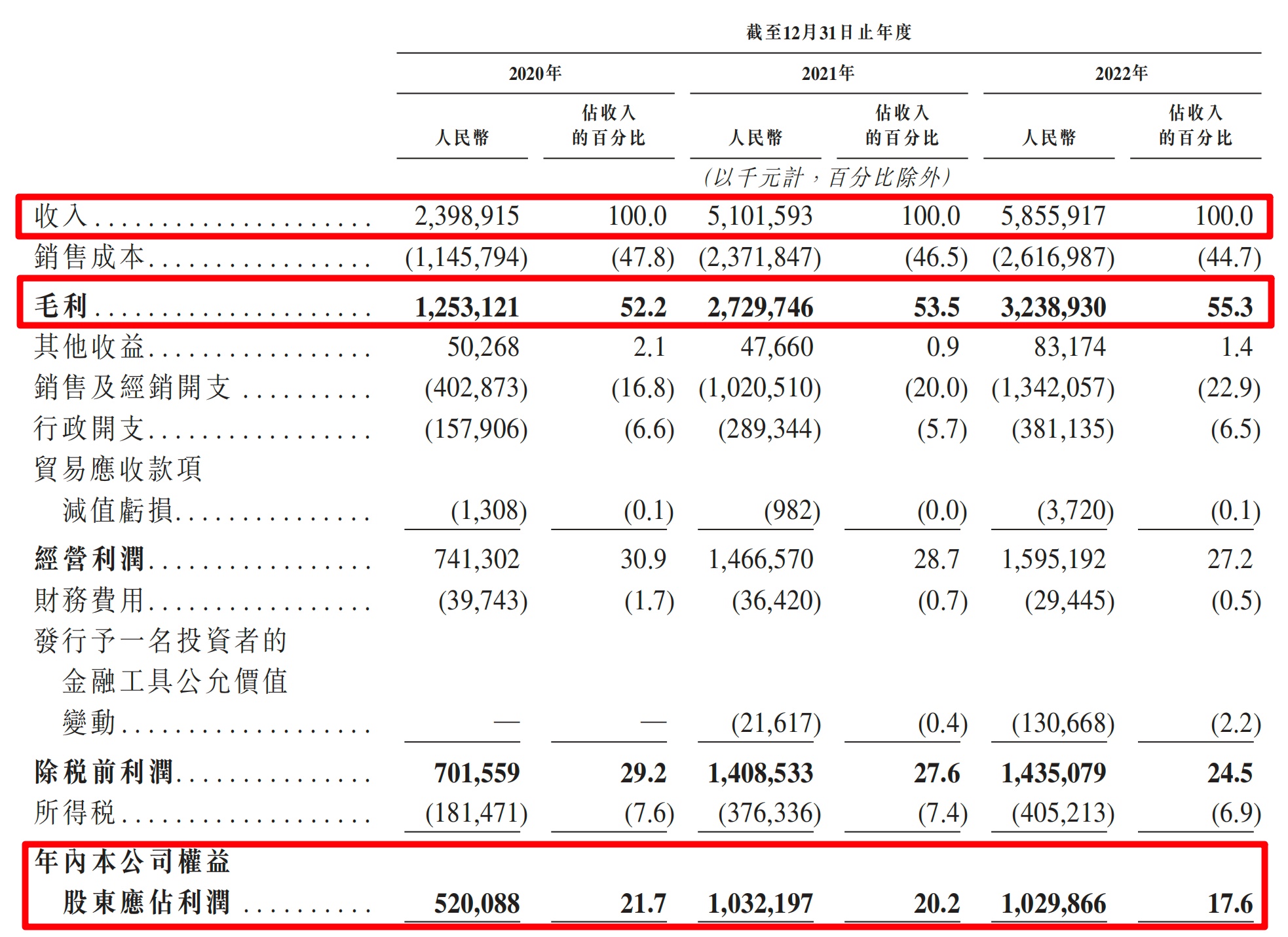 营收方面:公司在 2020 年、2021 年以及 2022 年期间,实现营收分别为 23.99 亿元、51.02 亿元、58.56 亿元,年复合增长率为 56.24%,这个增长率其实还是蛮高的,国内白酒行业的平均年复合增长率仅为 4.0%,公司目前的目前的增速水平还是比较高的。