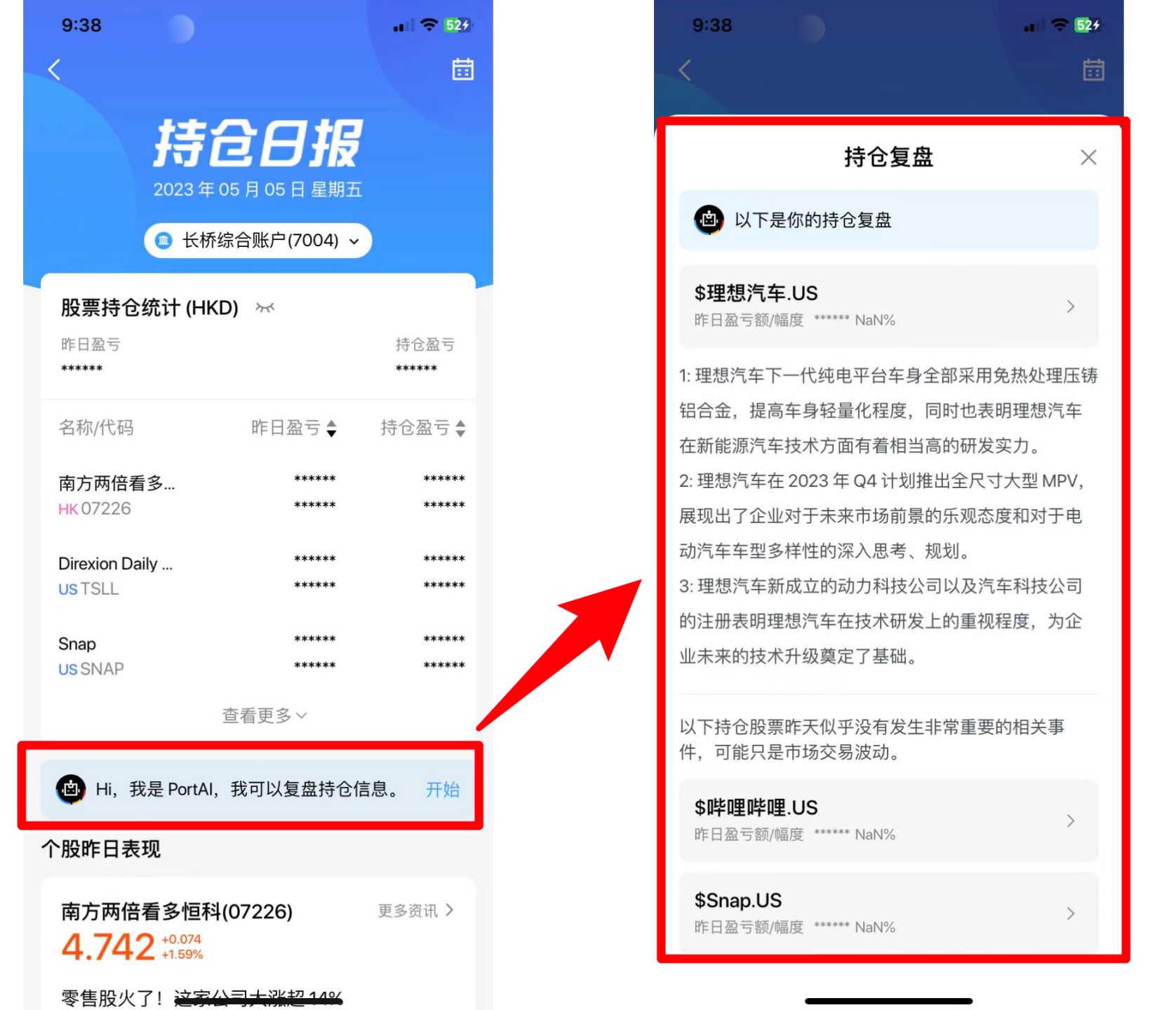持仓复盘,这是长桥 PortAI 又一智能投资辅助利器,简单来说,就是智能小助手通过当天重要咨询信息的统计汇总,帮助用户最快掌控市场动态,对持仓盈亏情况有更深的理解。