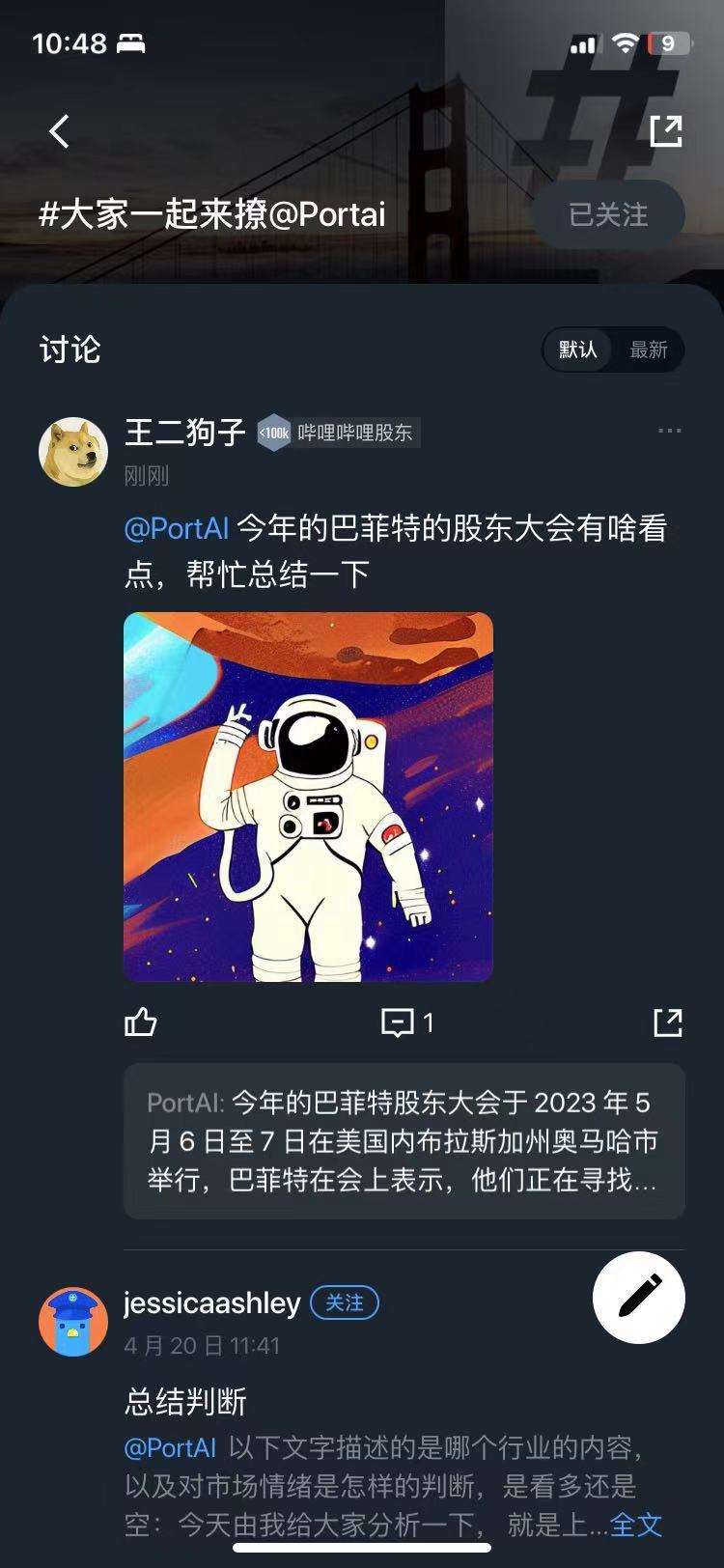 发帖直接艾特 PortAI 也是二狗哥最喜欢做的一件事,感兴趣的朋友可以关注下【#大家一起来撩 @Portai 】,在这个话题下面都是二狗哥没事就开撩 PortAI 的帖子,也欢迎喜欢撩 PortAI 的朋友在这个帖子下面提问。