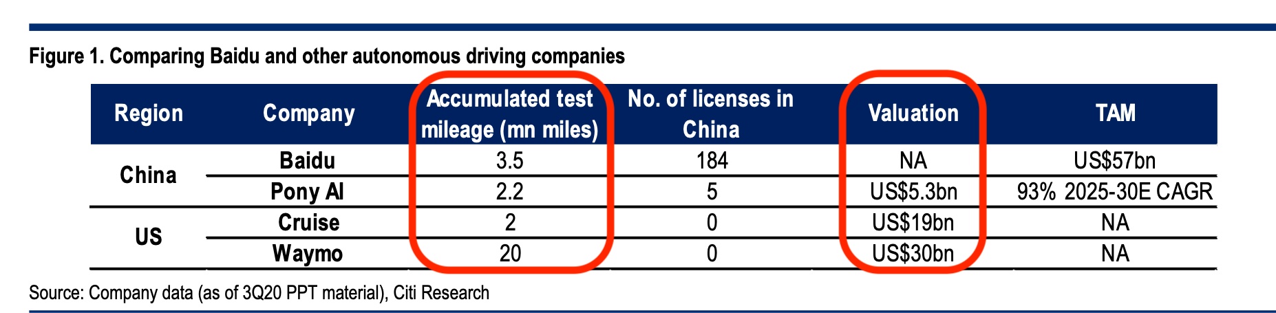 来自雪球用户陈达分享的花旗 2020 年三季度的研报数据,Waymo 当时的估值是 300 亿美元,Cruise 的估值是 190 亿美元,而 190 亿这个数字应该是 2019 年春天、即 Cruise 再上一轮融资时的数据,花旗没有更新。表格里值得注意的是,对四家公司(包括 Pony AI 小马智行)无人驾驶累积测试里程数(万英里)的对比,当时百度阿波罗高于 Cruise,明显低于 Waymo。单从这点看,百度阿波罗的估值应该是可以适当参照 Cruise 的。