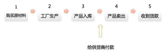 从 “购买原材料”~“给供货商付款” 这段时间,我们叫它 “应付账款周转天数”,说的就是该付给供货商钱的时间。