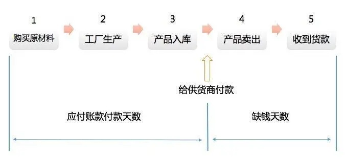 后面从 “给供货商付款”~"收到货款” 这段时间,就是公司 “缺钱的天数”。所以:做生意的完整周期又等于:“应付账款周转天数 + 缺钱的天数”。