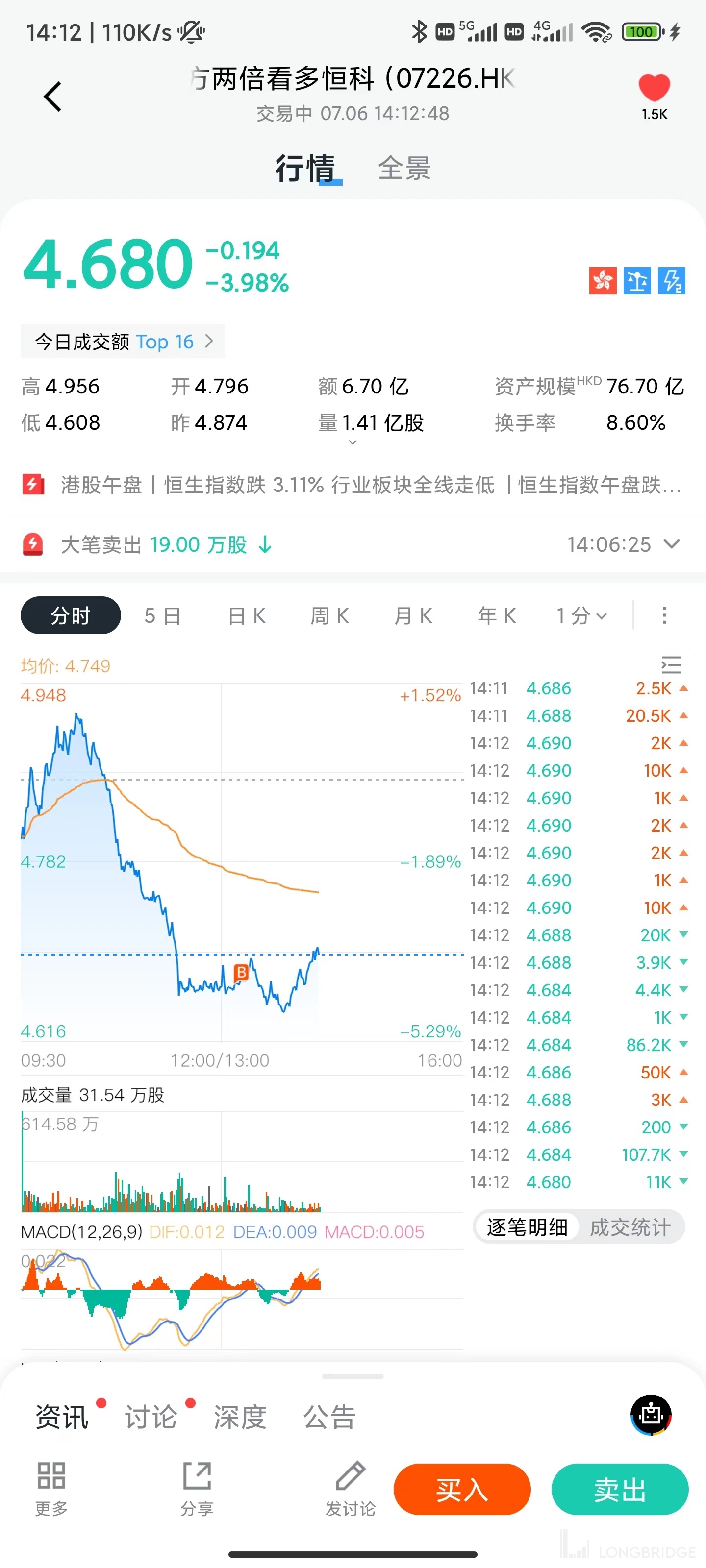 1、$XL2CSOPHSTECH(07226.HK) :二狗子一直套在这个 2 倍恒科,自从搞港美股以来就开始搞,不断做 T,光手续费恐怕都交了有小几千了吧,搞到现在还没有赚钱,不过也明白一个道理,在正确的方向坚持会有指数级的增长,在错误的方向坚持就是傻逼一个,二狗哥就是一个傻狗。。。等回血了,再也不搞港股了。。。说到做到。。。