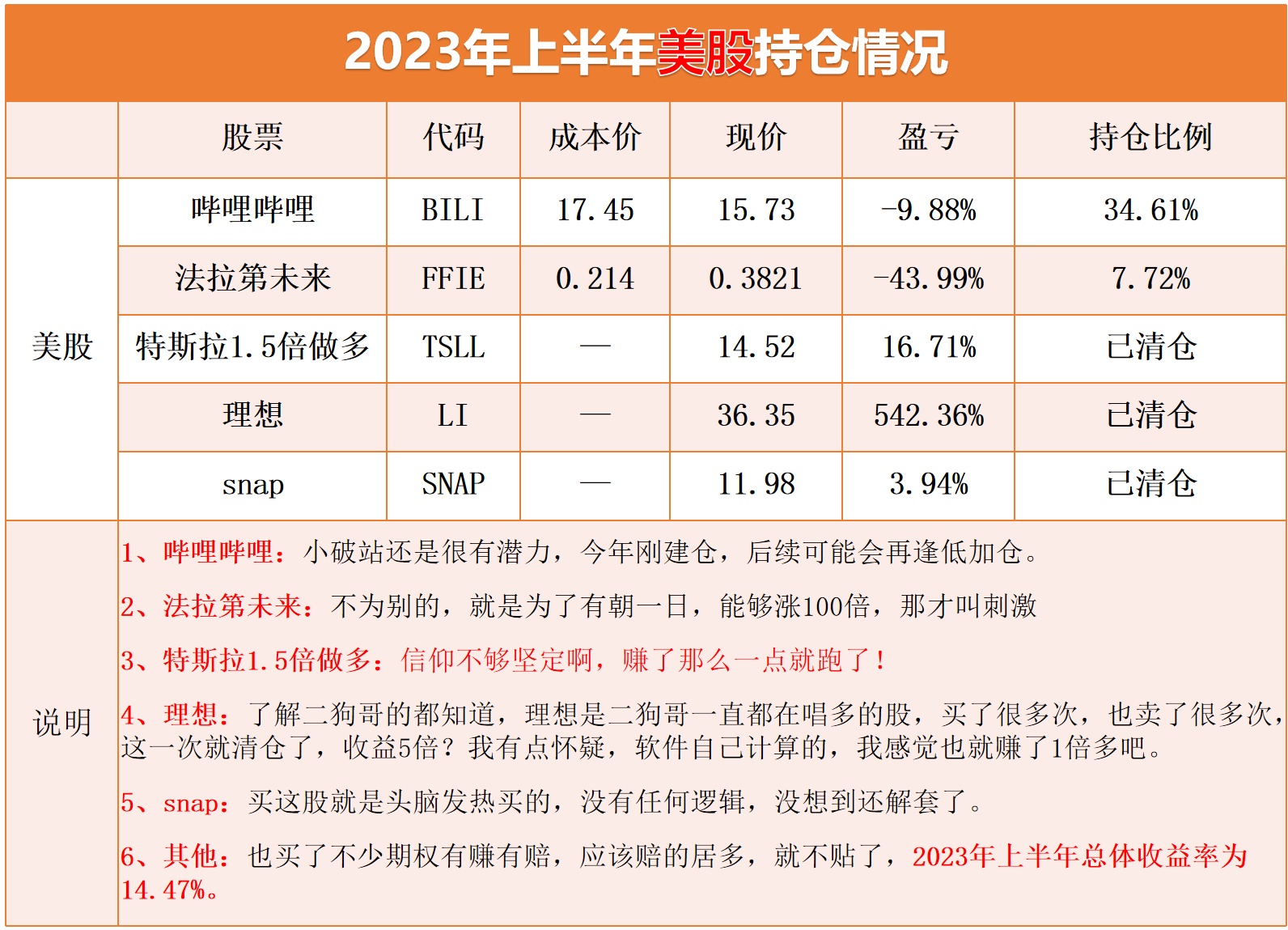 6、其他:也买了不少期权有赚有赔,应该赔的居多,就不贴了,2023 年上半年总体收益率为 14.47%。