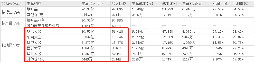 根据财报显示,2022 年恒顺醋业超过一半的营收都来自华东大区。具体数据方面,2022 年恒顺醋业在华东地区的营收为 10.59 亿,占营收的比例为 51.02%,而接下来的两大营收地区是华南大区和华中大区,实现营收分别为 3.392 亿和 3.379 亿,占营收的比例分别为 16.34% 和 16.27%,最后的西部大区和华北大区营收占比都在 10% 之下。