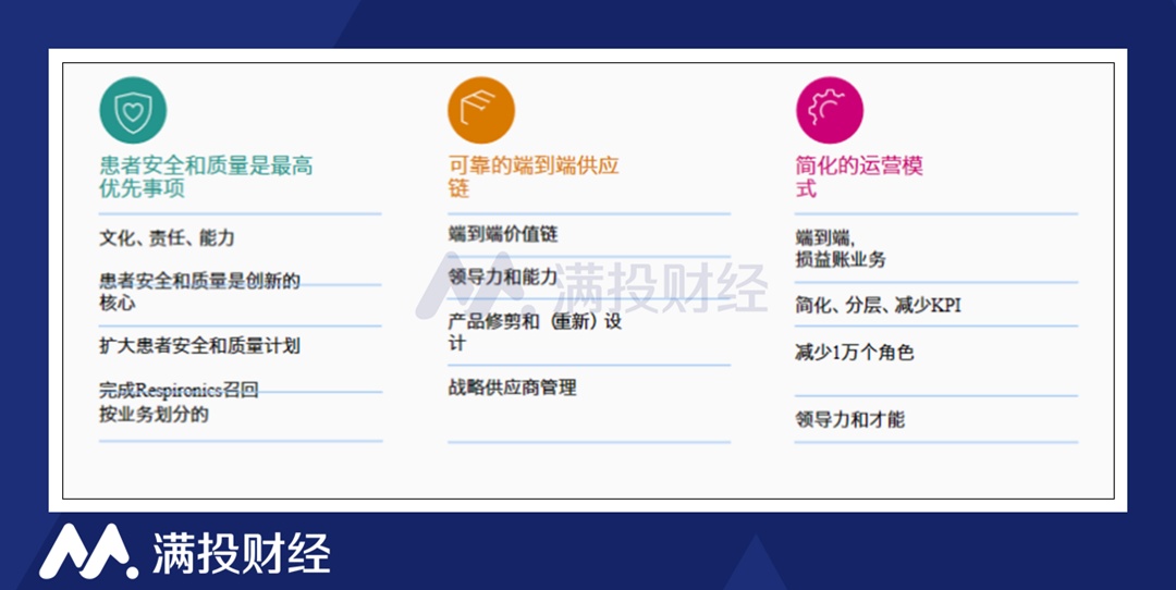 所以面对挑战,飞利浦也列出了三大优先事项计划。分别为解决患者的召回问题、可靠的供应链、简化的运营模式。