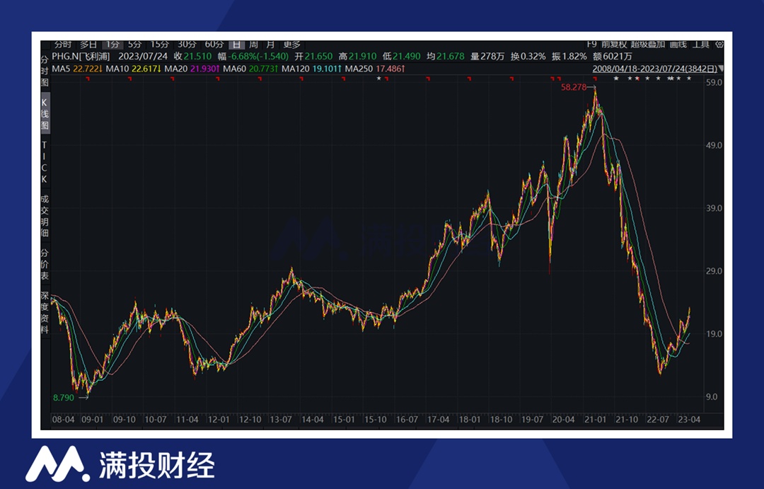 然而,尽管公司对未来充满信心,市场却并不买单。财报发布后,飞利浦的股价盘前跌超 6%,截至收盘,报 21.51 美元,跌 6.68%。事实上,飞利浦的转型也并非顺风顺水,受产品质量和供应链危机影响,公司的股价较高峰大幅下跌,当前正处于修复阶段。