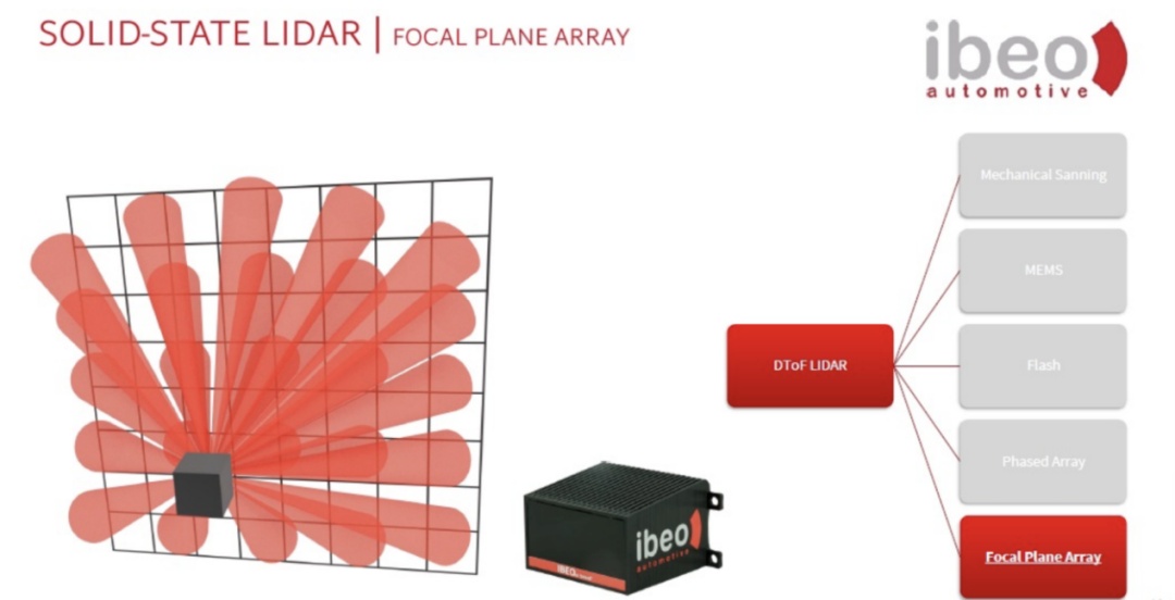 为了实现这一目标,国际老牌激光雷达厂商 ibeo 已经推出了一项区别于 OPA 以及 Flash 的全新固态激光雷达技术方案——单光子面阵技术,采用的是焦平面(Focal Plane Array)扫描的方式。